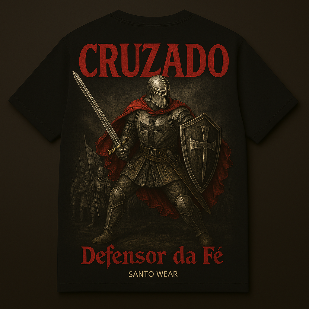 Um “Cruzado” carrega o espírito dos verdadeiros guerreiros da fé. Inspirada nos defensores espirituais, essa peça traz o desenho imponente de um cavaleiro com espada e escudo, pronto para lutar pela verdade. Com a frase Defensor da Fé , ela simboliza coragem, firmeza e fidelidade ao Reino.