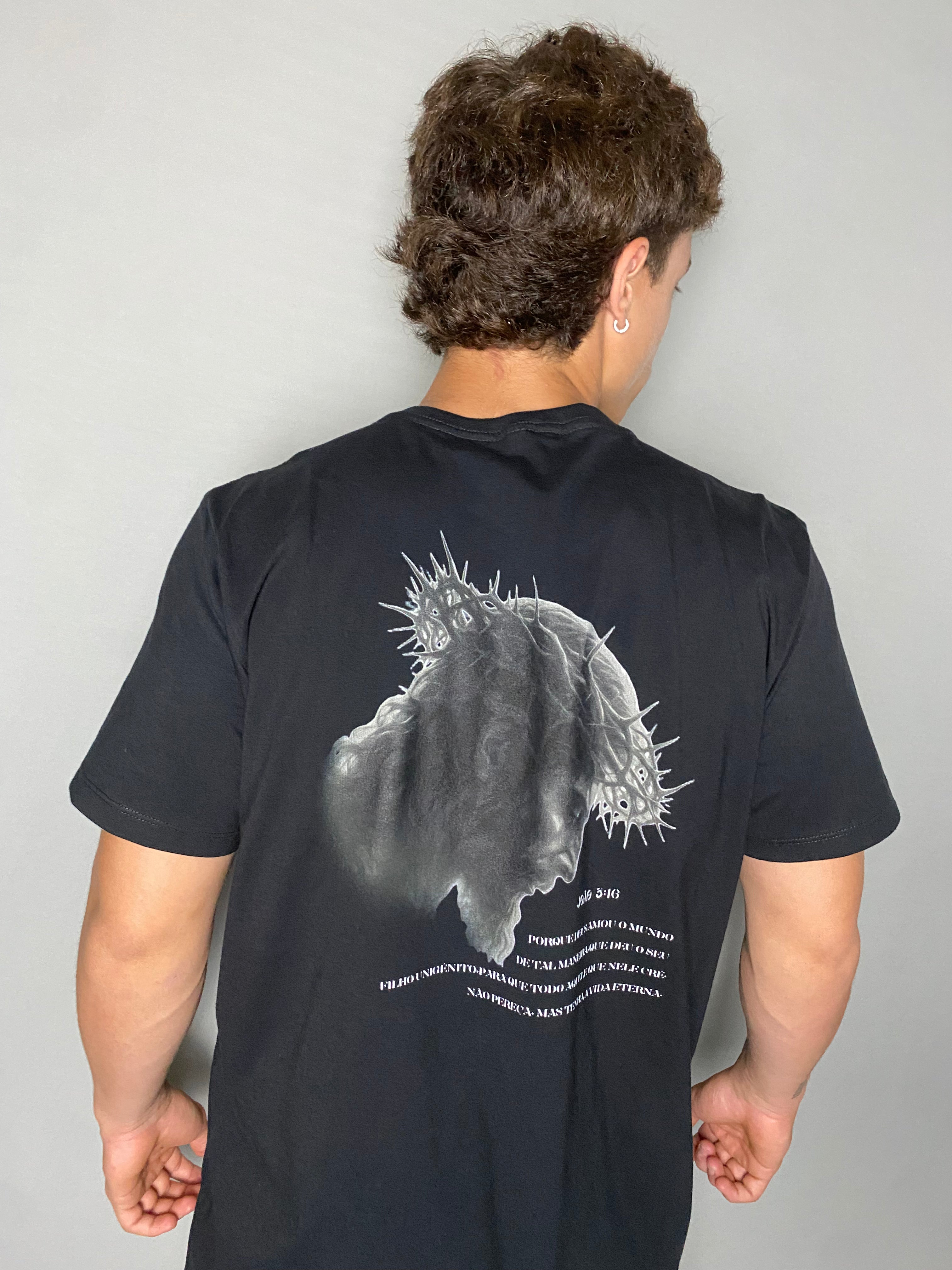 Inspirada em João 3:16, a estampa retrata Cristo em um momento de entrega, com a coroa de espinhos marcando o peso do amor que se sacrificou. A composição em tons escuros reforça a seriedade da cena e conduz o olhar para o essencial: a fé como caminho para a vida.