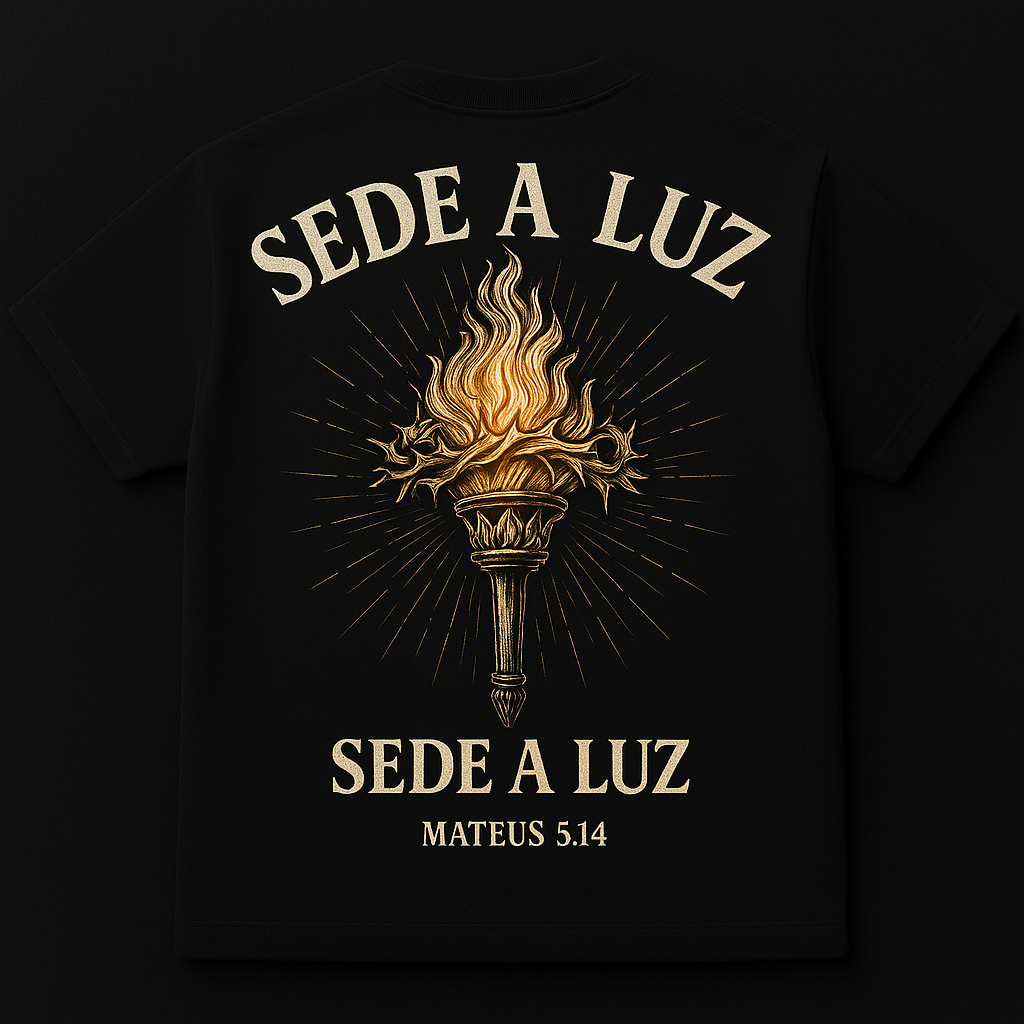A “Portadores da Luz” carrega uma mensagem clara: ser referência, presença e direção neste mundo. Com um design poderoso de uma tocha flamejante e o versículo de Mateus 5:14 — “Sede a luz” —, essa peça foi feita para quem vive com propósito e não apagada a própria fé.